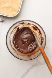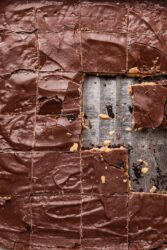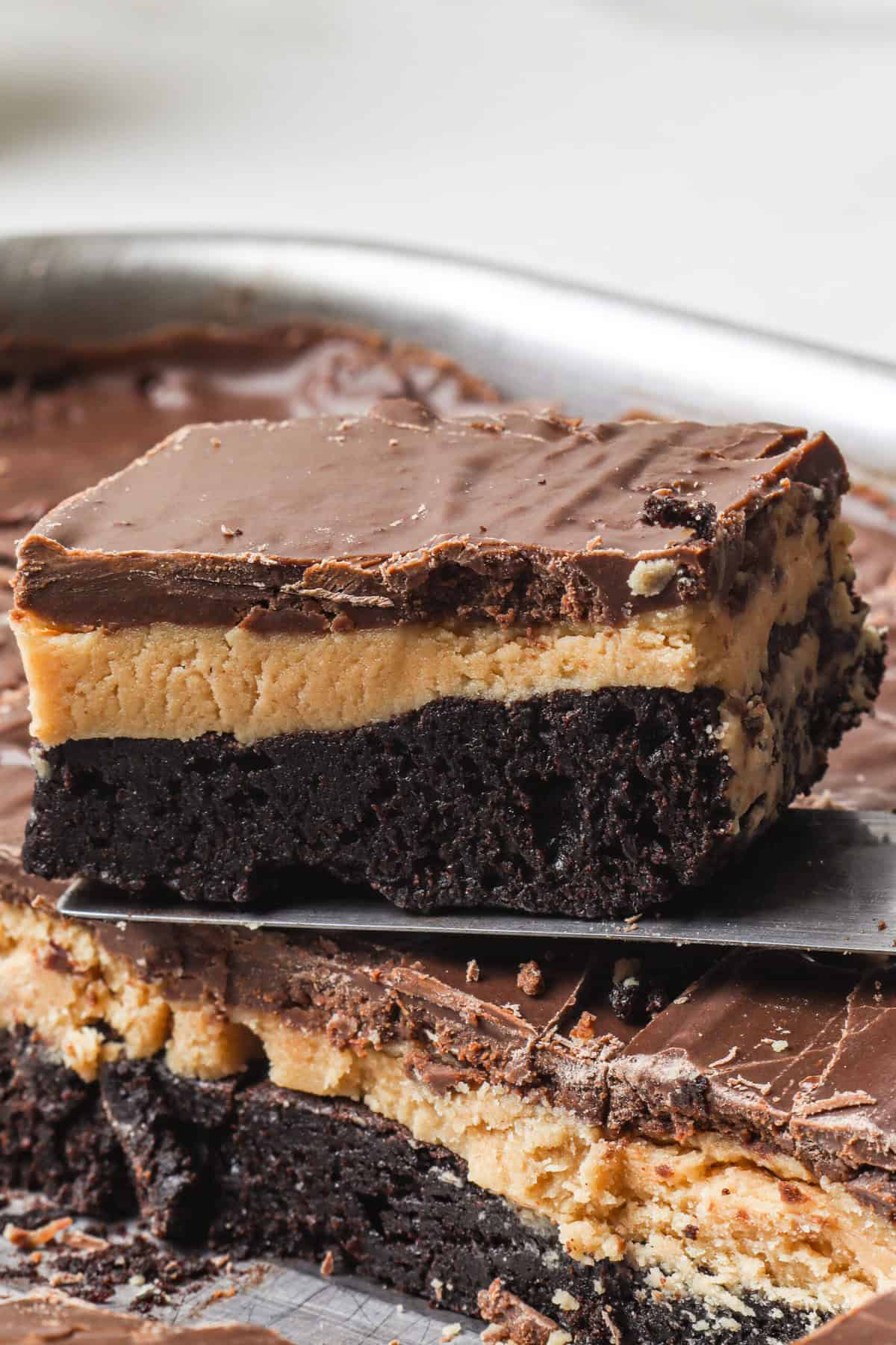 With the layers of peanut butter and chocolate that are poured on top of the brownie batter, it’s important that the mixtures be as smooth as possible. For the chocolate layer, make sure the chocolate chips are totally melted and thinned to the right consistency. For the peanut butter mixture, it’s best to use creamy peanut butter while staying away from all-natural brands because they can be too oily. You can also consider using a hand mixer or a stand mixer to ensure the smoothness of the peanut butter layer.