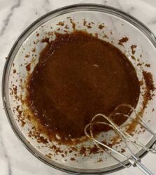 - In a separate medium bowl, use an electric hand mixer to beat the sugar and oil just until the sugar is moistened. Add the remaining ingredients, except the chocolate chips, and beat until JUST combined, only about 20 seconds or so. You don't want to beat too much air into the batter or the brownies will sink when baking.