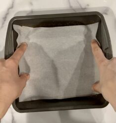 - Preheat oven to 350°F. Line the bottom of an 8-inch baking pan with parchment paper.