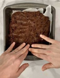 I have a trick for this recipe that results in the chewiest gluten-free, dairy-free brownies you’ll ever have! Once you pull the brownies from the oven, let them cool on the counter for about five minutes. Then, place a hot pad on a fridge shelf and place the pan on the hot pad. Cool your brownies in the fridge for 45 minutes, remove—and voilà! You’ve got insanely chewy treats that are still gooey inside! The rapid cooling prevents further cooking from residual heat while helping to lock in moisture. But do not leave them in the fridge longer than 45 minutes! They may start to dry out after that point.