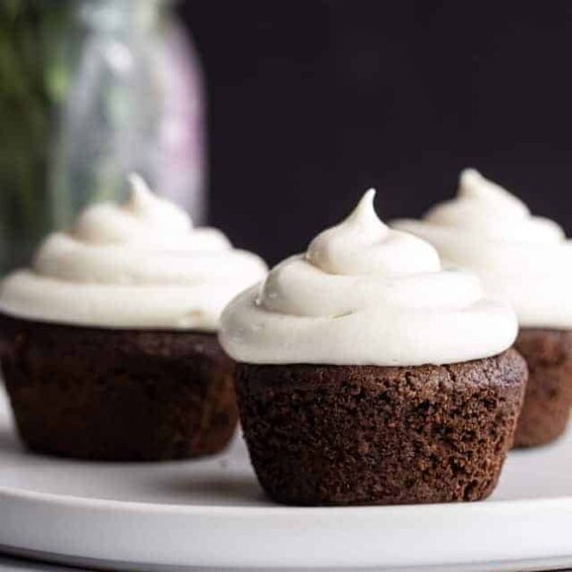 Delicious!! I used maple syrup in place of honey in the cake, ‘Bake Believe’ semi-sweet chocolate chips in place of the dark chocolate, added a tablespoon of cocoa with the flour, and used corn starch in place of the tapioca flour. Oh, and I doubled the frosting. Came out so good!