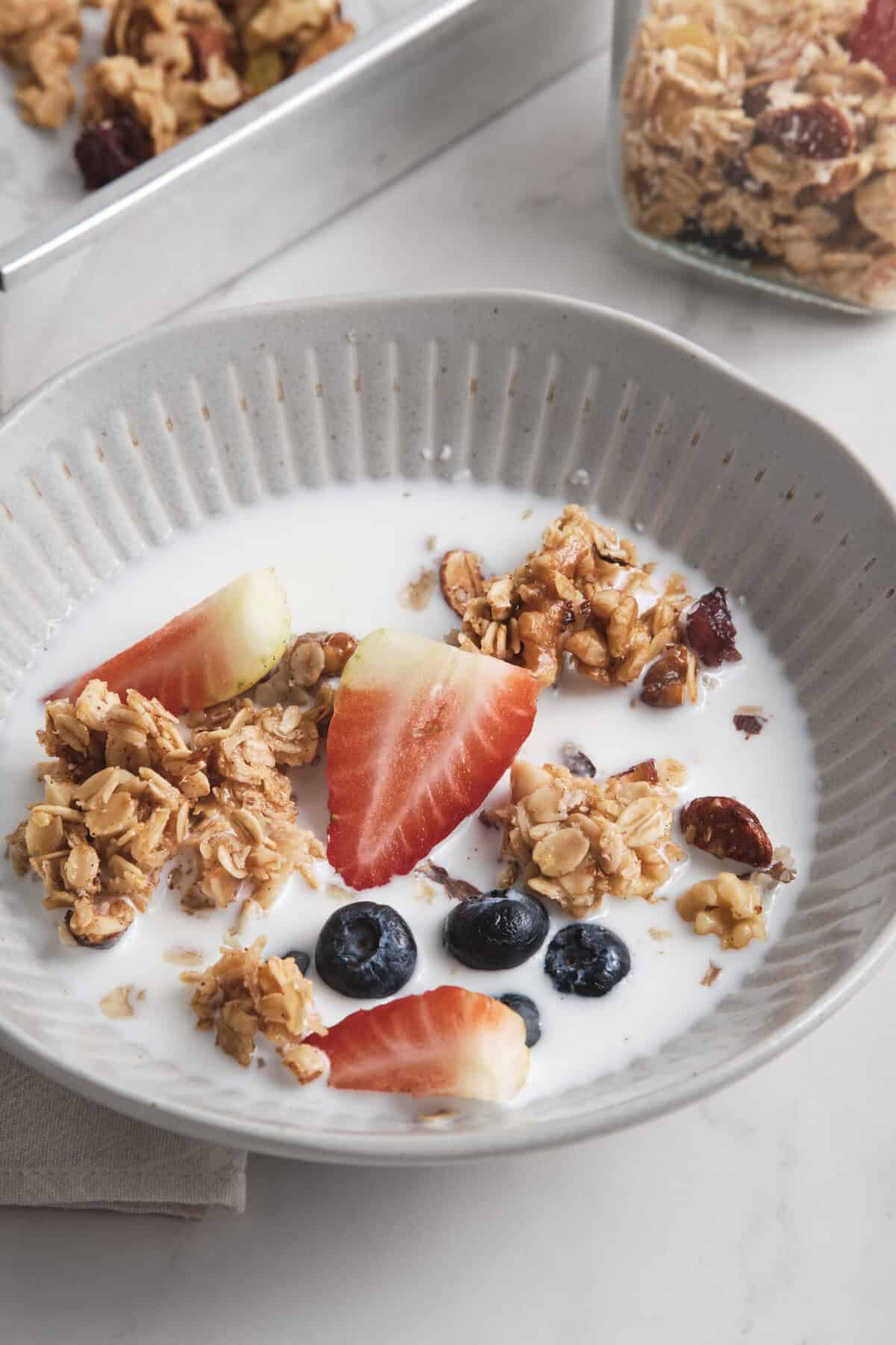Oh, and it seems I’ve left out one more key detail: it’s absolutely delicious! This homemade gluten-free granola, flavored with maple syrup and vanilla extract, blows store-bought options out of the water. Read on to learn how to make it yourself, then get ready to enjoy it with a bowl of yogurt, milk, or fruit.