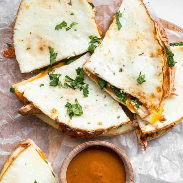 Be forewarned, Mexican food fans. These are not your typical quesadillas. This recipe takes things in a lighter direction. Instead of tortillas, you’re using egg whites, which add protein and lessen the carb load. If you’re looking for a healthier way to satisfy your quesadilla cravings, this might be it. The egg whites create a perfectly soft yet sturdy “tortilla” that holds all the fillings together surprisingly well!