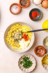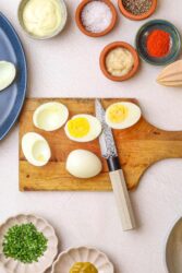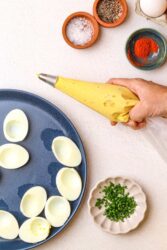 What I like about this horseradish deviled eggs recipe is its simplicity. A short ingredients list means each element gets a chance to shine! Rich egg yolks blended into creamy mayo and tangy mustard perfectly balance the piquant bite of horseradish. Paprika’s smoky depth and the savoriness of the chives keep it all grounded, while the lemon juice adds just a hint of citrusy freshness. You can tailor those ingredients to your preferences, but they hit exactly the right notes to trigger happy memories of the deviled eggs my mother used to make!