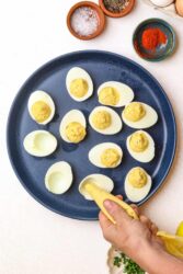 - Fill a piping bag with the yolk mixture. Pipe the yolk mixture into the egg white halves, overfilling them slightly so the mixture mounds.