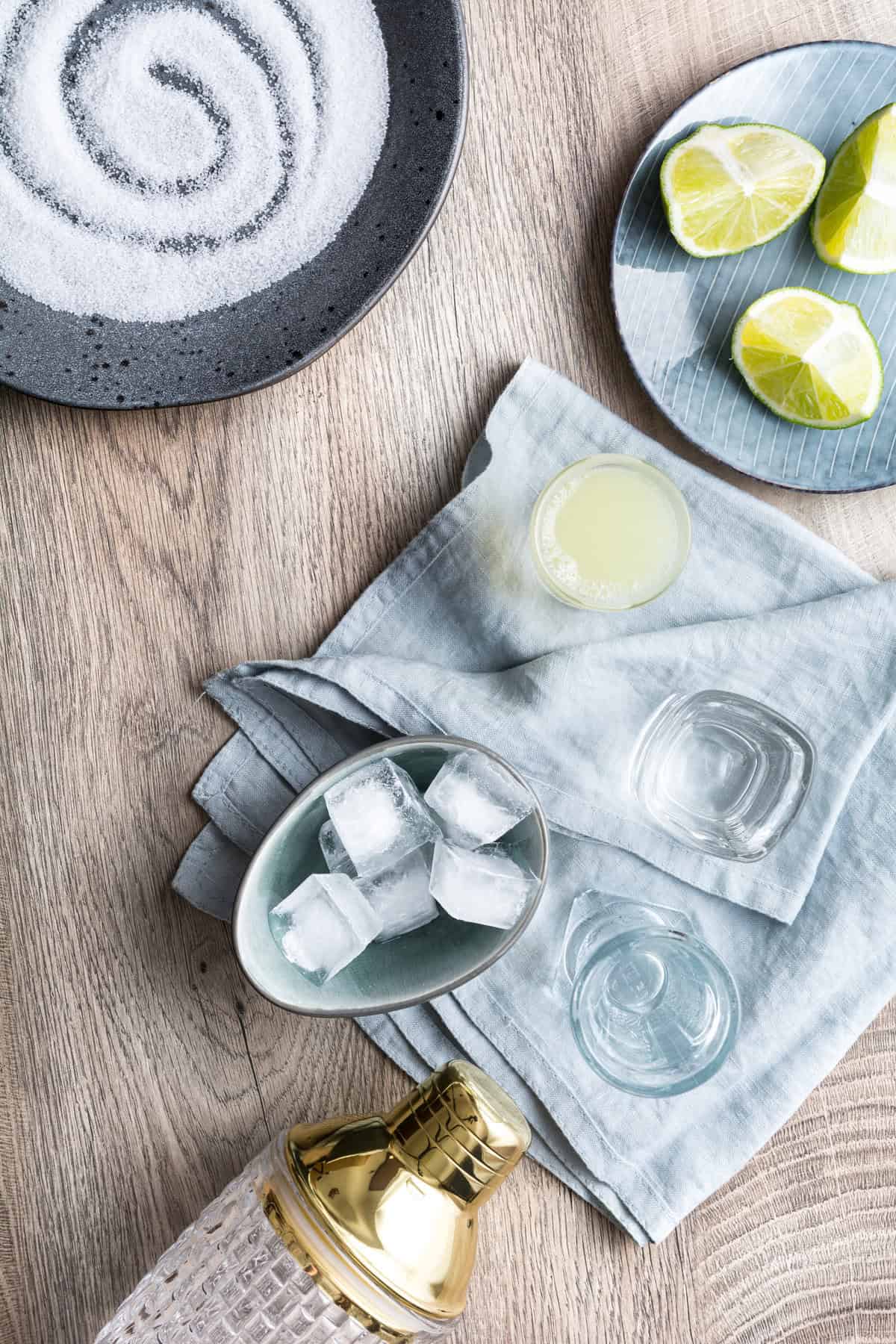 - Fill a cocktail shaker with ice. Add the tequila, triple sec, and lime juice.