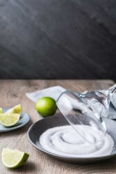 - To create a salt rim, run a lime wedge around the rim of a chilled margarita or rocks glass. Dip the rim into a shallow dish filled with salt. Set aside.
