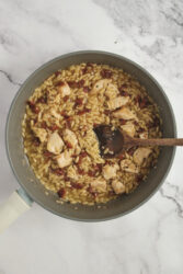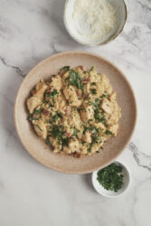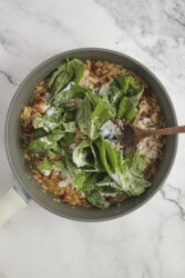 I’d been making orzo for a good few years before I realized that it wasn’t rice. Can you blame me? Look at the shape! Alas, I was wrong. It’s pasta. Tiny pasta. Unlike typical pasta, you don’t boil orzo, at least not for this recipe. Orzo cooks with the broth and cream, drinking in all that flavor. You know what that sounds like? Rice. So, consider yourself forgiven if you thought the same as I had!
