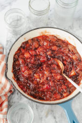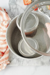 - While the jam cooks, sterilize clean glass jars and lids. When the jam is ready, carefully ladle it into the hot jars, leaving 1/4 inch headspace. Process the filled jars in a water bath canner for 10 minutes, then let them cool undisturbed for 24 hours to ensure a proper seal.